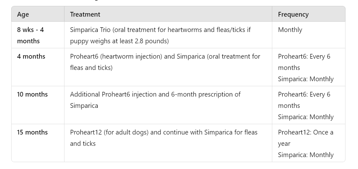 When your puppy reaches about 15 months, they will switch to Proheart12, suitable for adult dogs. This injection offers a full year of heartworm protection and eliminates the need for monthly treatments. Simparica will still be available to be given monthly for fleas and ticks.